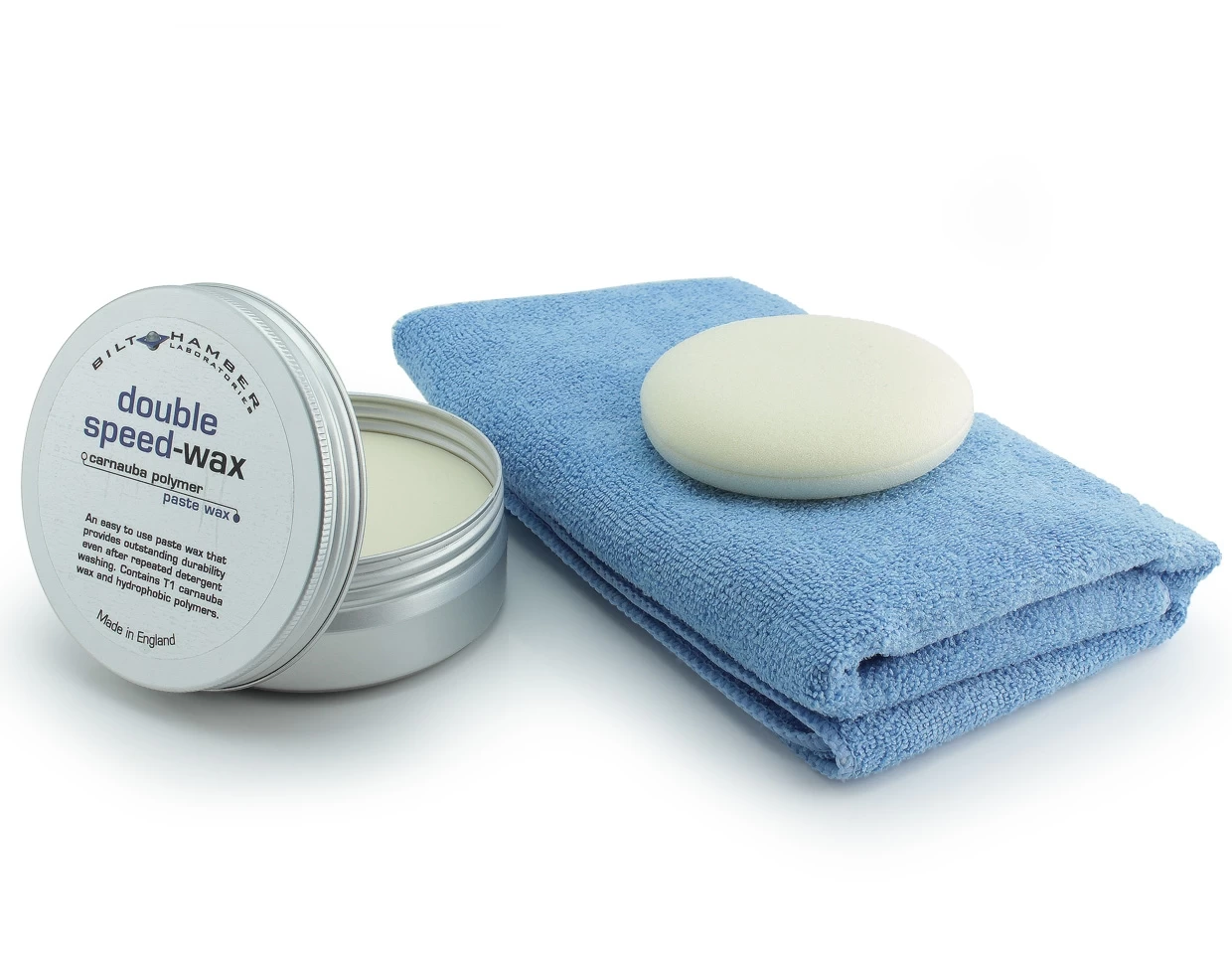 The Bilt Hamber Double Speed wax is supplied with a soft foam wax applicator and large microfibre towel for buffing off.