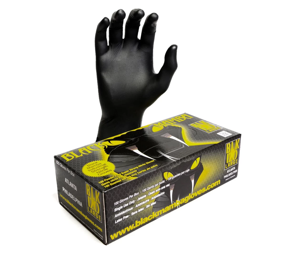 Black Mamba Nitrile Gloves are made with patented NITREX® polymer, this super strong (6.0 mils) powder-free nitrile glove boasts 3 times the chemical and puncture resistance of a comparable thickness latex or vinyl glove. Black Mamba Gloves feature a grip rite finish for secure handling and dexterity even when working with fine objects.