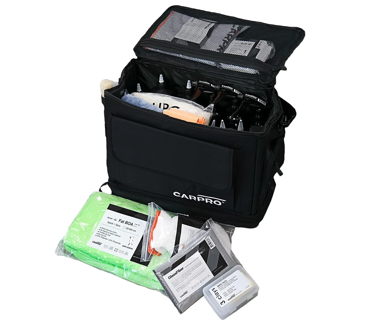 The CarPro XL Detailing Bag is manufactured from an easy-clean, tear-resistant synthetic Nylon material with reinforced shoulder strap, heavy-duty zips and a rubber base.