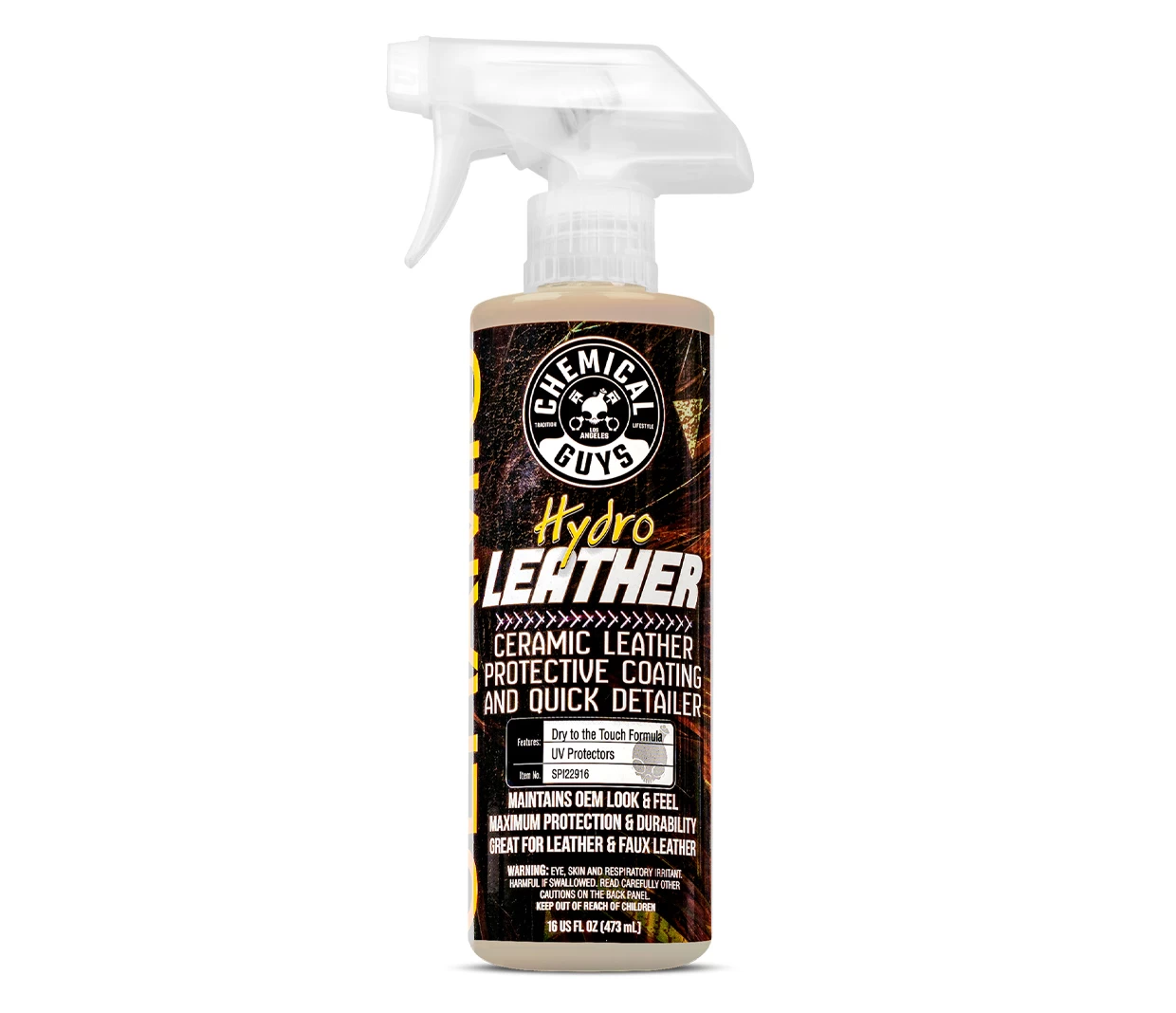Chemical Guys Hydro Leather Ceramic Leather Protective Coating delivers a durable ceramic protective barrier on leather surfaces that helps resist dirt, UV rays, and discoloration and keeps your leather looking and feeling new longer without leaving behind any residue!
