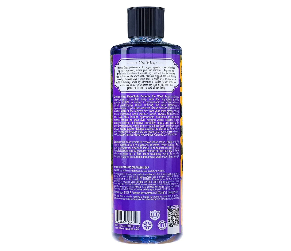 Chemical Guys Hydro Suds Ceramic Car Wash Soap combines a hyper-foaming pH neutral soap with the high-gloss shielding properties of SiO2 to deliver a hydrophobic wash that delivers a brilliant jaw dropping shine.