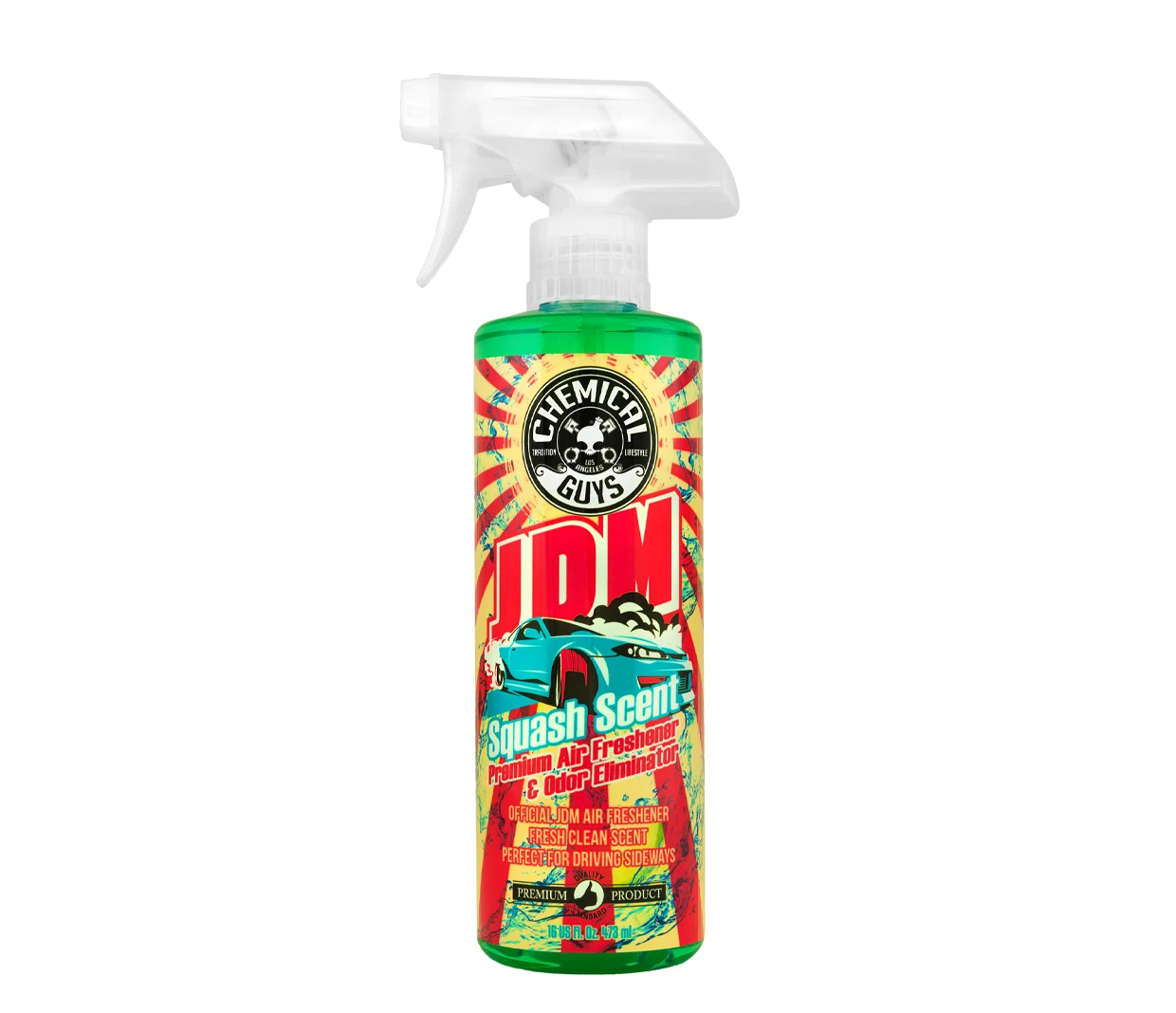 Chemical Guys JDM Squash is a sprayable air freshener with a fresh and clean soapy scent with a subtle citrus top note and a candy finish. All those back road trips and highway pulls were made sweeter with JDM cartridge air fresheners emanating the invigorating fragrance of soap, citrus, and candy. Now, you can mist that pleasing fresh aroma anywhere! JDM Squash Scent pleases the senses with the fresh scent of cleanliness and fresh air. Enjoy the luscious scent of tuned up drift machines with JDM Squash Scent!