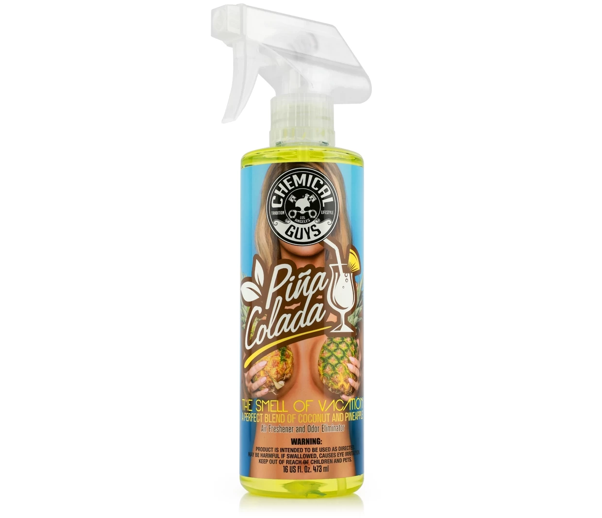 Chemical Guys Pina Colada fresh pineapple and coconut scent smells like tropical paradise with every spray no trip to Puerto Rico, hawaii, or o’malley’s would be complete without sipping a the cool concoction in the shade on a sunny beach. The iconic cocktail is loved for its refreshing taste and fruity sweet scent. And although you can’t sip the beverage behind the wheel, you can certainly enjoy the tropical scent anywhere, any time with Chemical Guys Pina Colada air freshener & odor eliminator.