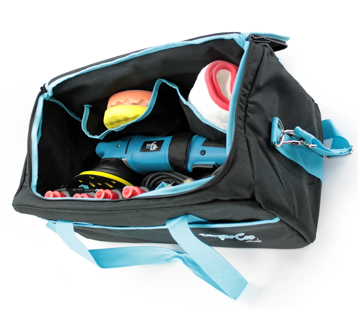 Manufacturerd from hard wearing, padded water resistant nylon, this kit bag was developed specifically by detailers for detailers. It’s large enough to hold a machine polisher such as a Rupes, Flex, DAS-6 or DAS-6 PRO PLUS. Infact it will quite comfortably fit two machines with still space for pads, polish and accessories.