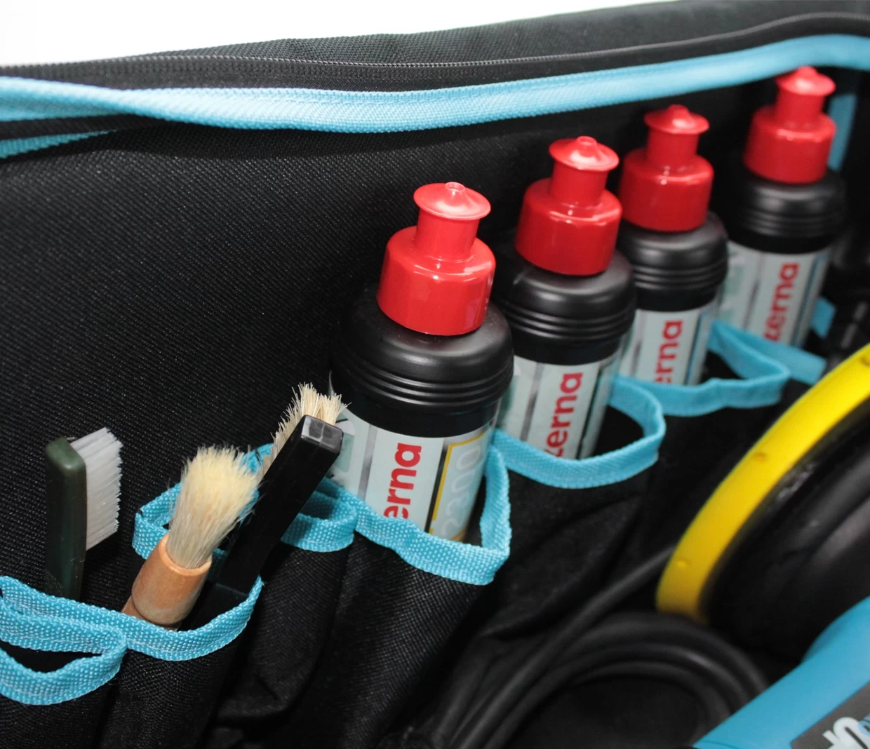 Measuring 510mm x 300mm x 270mm inside there are 10 different sized pockets and a central velcro strap to hold your machine in place theres no better storage solution for all your detailing gear.