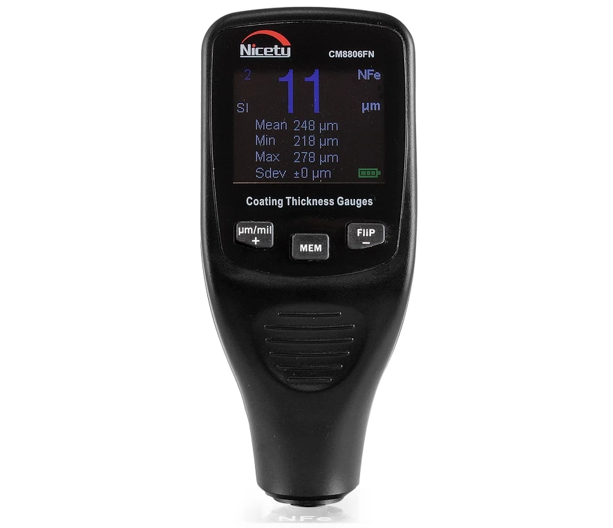 With a automatically switching, integrated F/NF probe, this gauge works on both non-Ferromagnetic metal bases (e.g aluminium, brass, stainless steel, etc.) as well as non-magentic Ferromagnetic bases (e.g Iron, Nickle etc.)