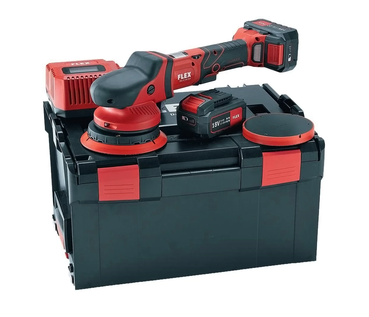 The Flex XFE 150 kit comes with 2 x 18v batteries, a charger as well as both a 6″ (150mm) & a 5″ (125mm) backing plate, all contained within the rigid container supplied.