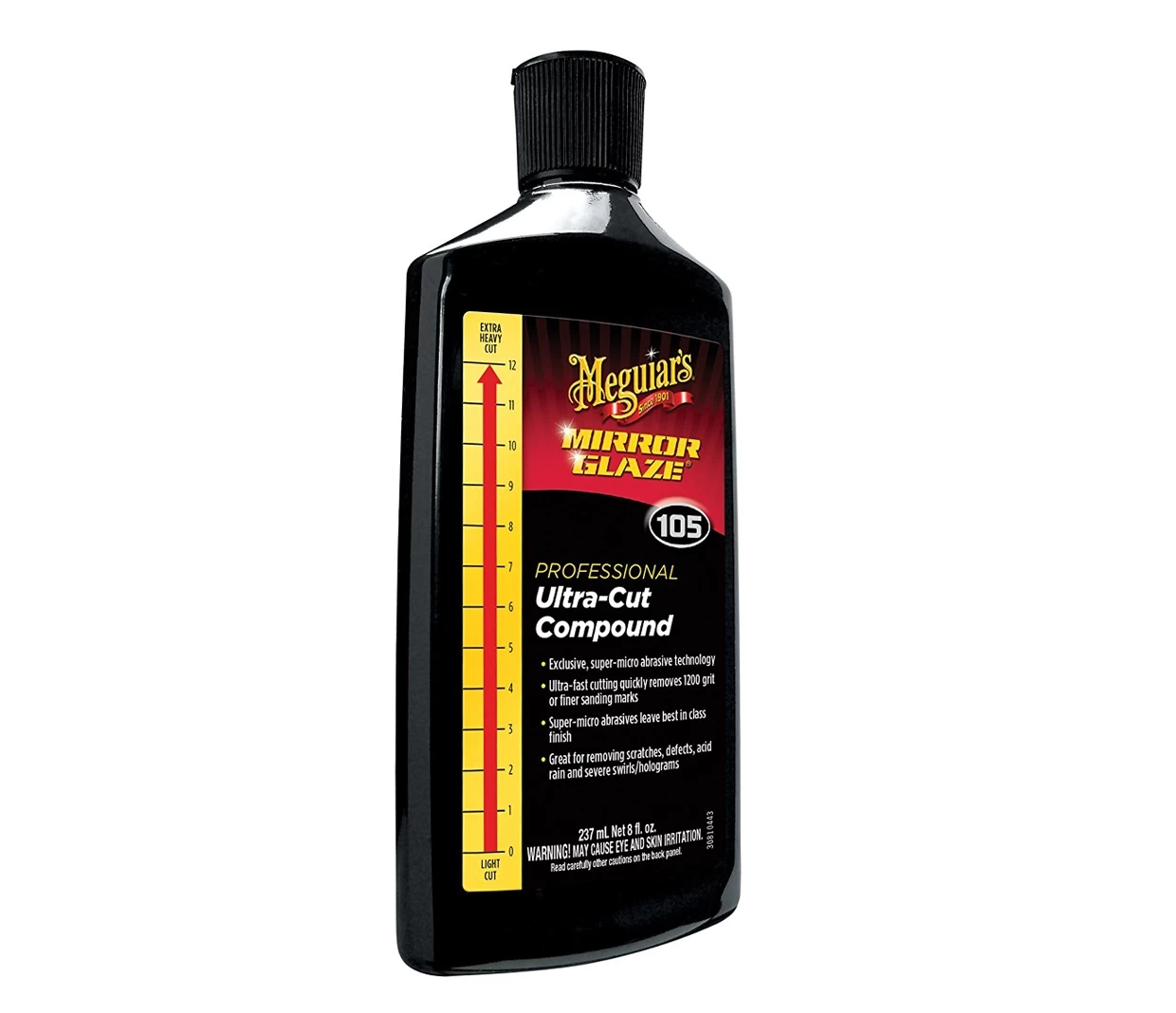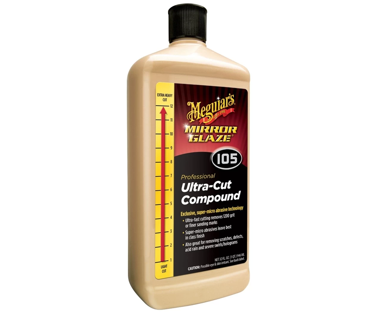 For the best results, apply Meguiars 105 Ultra-Cut Compound with a rotary polisher. Work at a maximum speed of 1500 to 2000 RPM with a foam or wool cutting pad. Work until the compound starts to dry. Wipe off the residue with a clean microfibre towel.