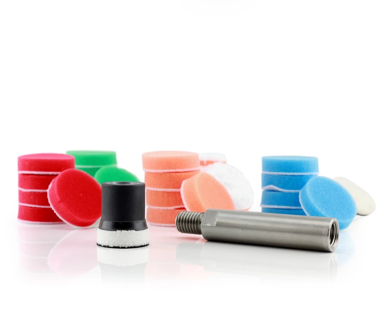 If you have a rotary polisher and ever wondered how to polish those tricky to reach areas then this might just be the answer. These innovative pad kits from ShineMate is designed to allow you to use a 1.2″ or 2″ backing plate with your regular rotary polisher, totally transforming it so it’s now possible to polish places that were previously impossible to reach.