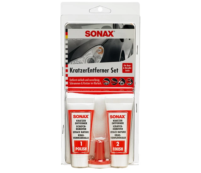 Polishing set for manually removing localised scratches from paintwork top coats. Through multi staged sanding and polishing processes, even deep scratches can be removed, provided that they have not penetrated into the base coat.